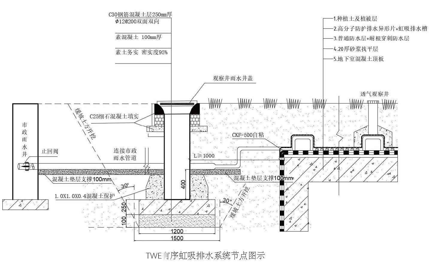 1、土壤下滲水持續(xù)向下滲透,通過高分子防護(hù)異型片流至虹吸排水槽內(nèi)。