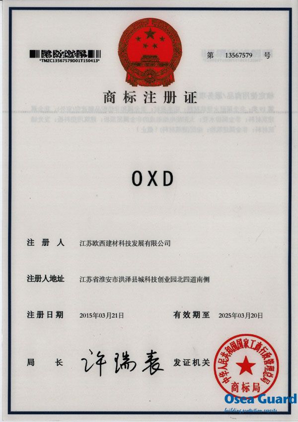 隨著公司業(yè)務(wù)規(guī)模的遞增及業(yè)務(wù)范疇的擴(kuò)大,公司知名度顯著的提高。為滿足公司品牌戰(zhàn)略及市場發(fā)展的需求,提升競爭力,公司領(lǐng)導(dǎo)決定申報(bào)“歐西盾、“OXD”商標(biāo),經(jīng)過國家商標(biāo)總局的初審核準(zhǔn)、公告等程序,正式獲得由國家工商行政管理總局商標(biāo)局頒發(fā)的商標(biāo)注冊證書。注冊內(nèi)容涉及范圍廣泛,更加貼合公司的品牌發(fā)展戰(zhàn)略。