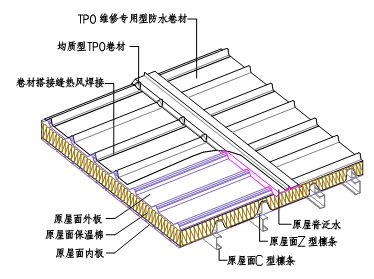 TPO防水卷材在金屬屋面維修工程的應用 針對目前瀝青類卷材以及防水涂料在壓型金屬屋面維修的現(xiàn)狀,東方雨虹研發(fā)了金屬屋面維修專用型TPO防水卷材。維修專用型TPO防水卷材采用更加柔軟的材料配方體系,使之能貼合壓型鋼板的波形進行粘結(jié),屋面采用整體維修的方式,從根本上解決金屬屋面滲漏的問題。