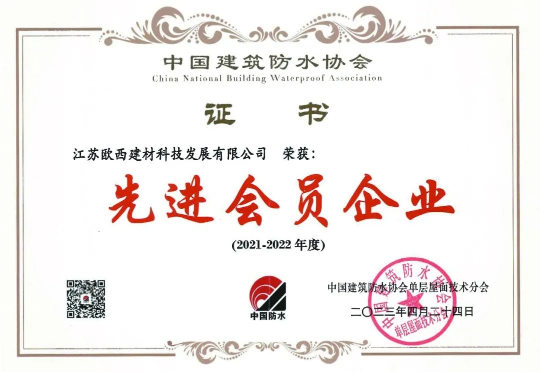 榮耀歐西丨歐西榮獲建筑防水行業(yè)單層屋面領域先進會員企